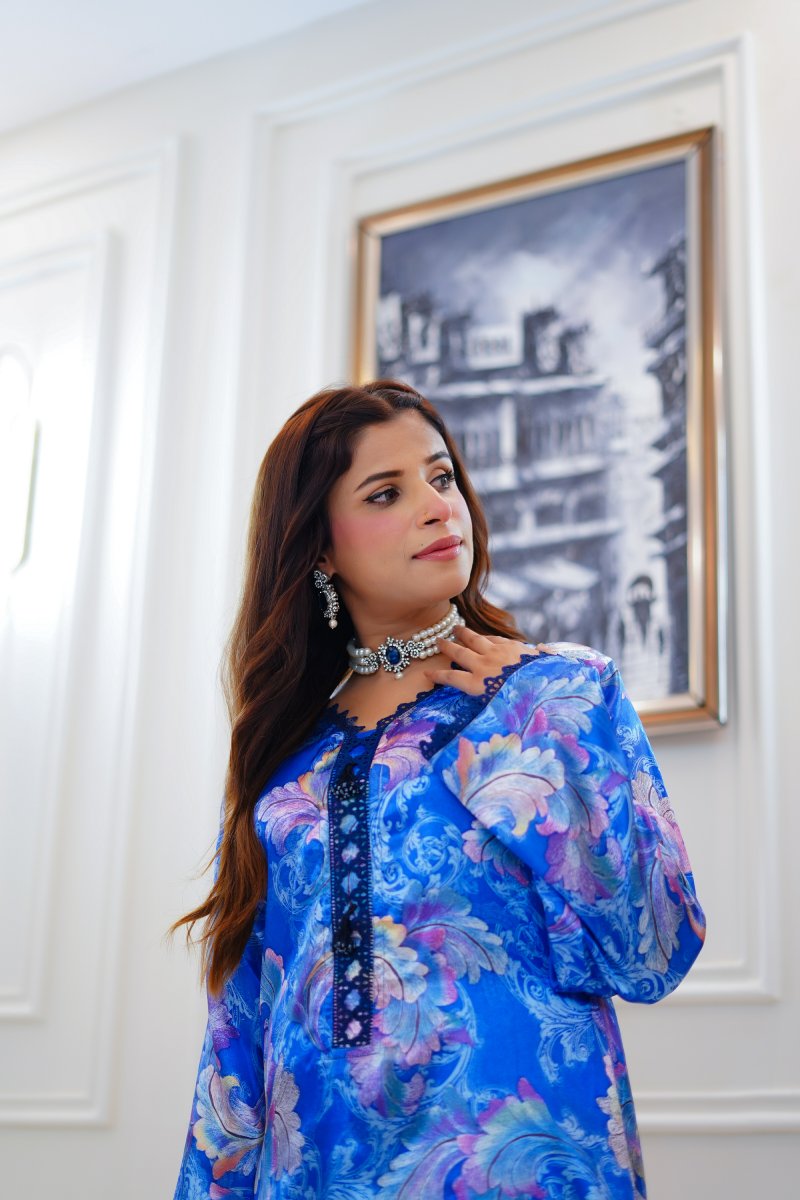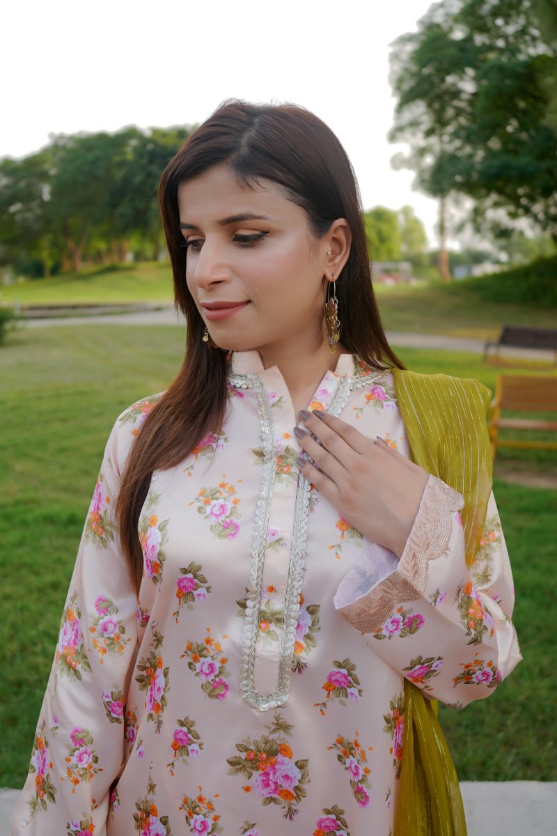 Discover timeless charm with Ayra Bloom, a premium silk ensemble featuring delicate floral prints, elegant gotta lace detailing, and a graceful pink net dupatta. Designed for effortless festive elegance, available in all sizes. ( net dupatta)