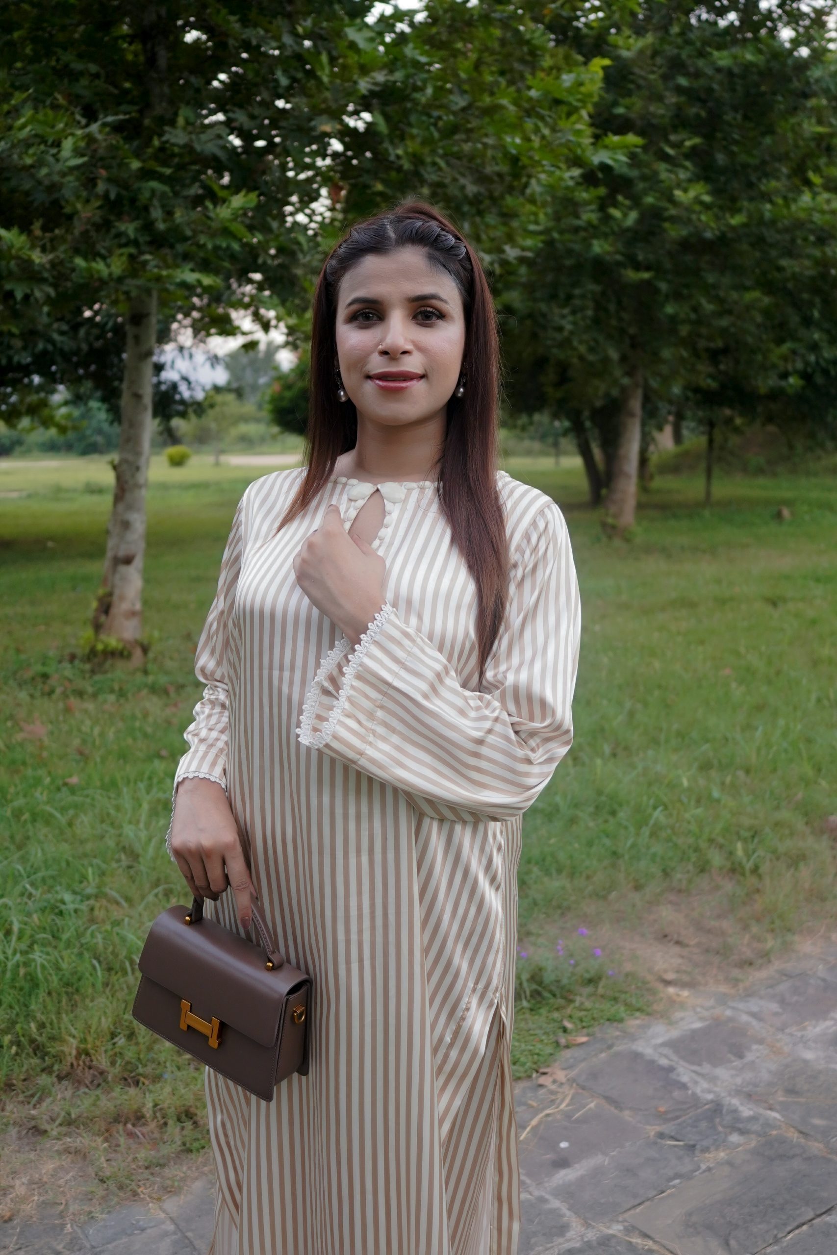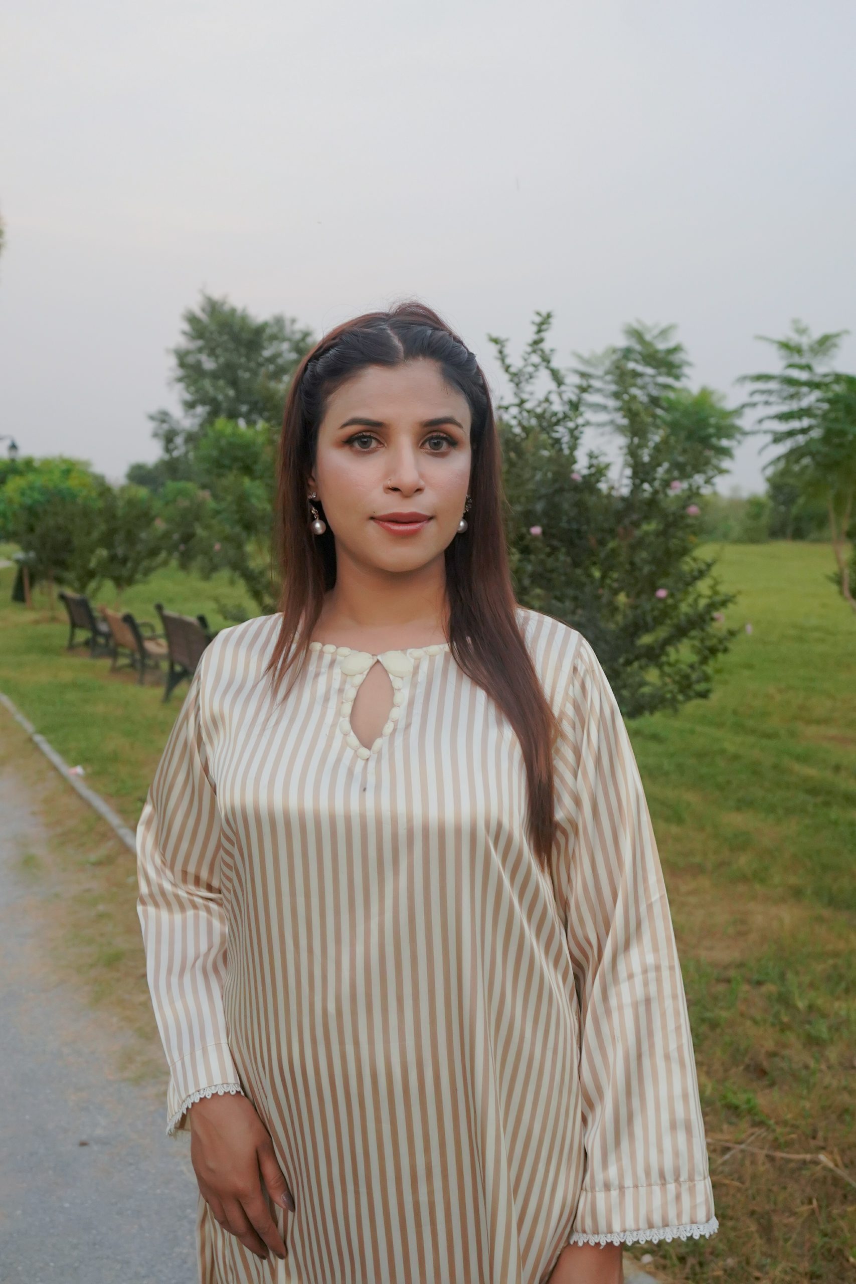 Radiating purity and grace, Serene is a white silk long shirt adorned with golden line patterns and an elegant stone-detailed neckline. The lace-embellished sleeves complete its timeless charm, making it a perfect blend of sophistication and luxury.